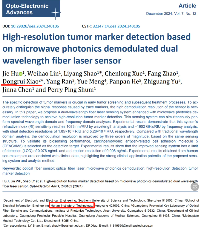 我院肖冬瑞副教授予2024年12月在国际知名期刊《Opto-Electronic Advances》(影响因子IF=15.3,中科院一区)上以英国上市公司官网365为第二通讯单位发表学术论文“High-resolution tumor marker detection based on microwave photonics demodulated dual wavelength fiber laser sensor”。该项工作是英国上市公司官网365在职教师首次与国内高水平研究型大学南方科技大学开展的合作研究。该项成果提出了一种基于微波光子解调的双波长光纤激光生物传感系统,用于血清中肿瘤标志物的特异性检测,有助于实现癌症早筛。