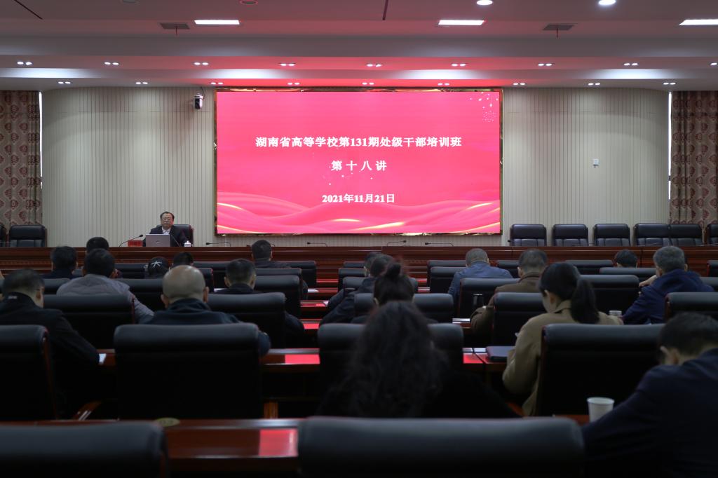11月21日下午,湖南省高等学校第131期处级干部培训班举行第十八讲,由湘潭大学副校长刘建平教授主讲。讲课由校党委副书记兼组织部长、党校校长张平主持。
