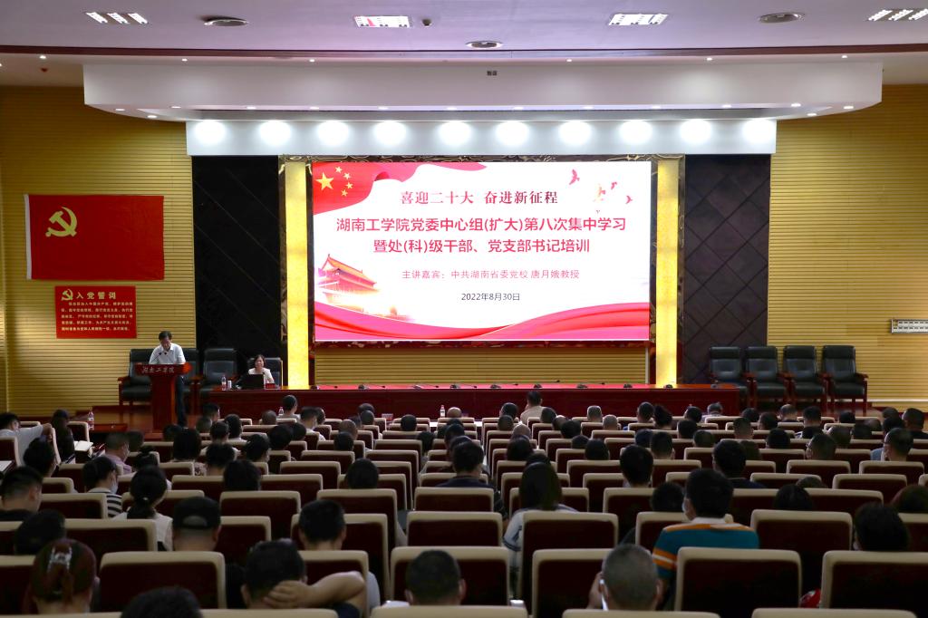 8月30日下午,学校在500人报告厅举行2022年处(科)级干部、党支部书记培训,专题学习今年7月26日习近平总书记在省部级主要领导干部专题研讨班重要讲话精神和《习近平谈治国理政》第四卷。本次集中学习培训特邀请到中共湖南省委党校、湖南行政学院唐月娥教授作专题辅导报告。校党委书记宋克慧主持学习。全体校领导、副科级以上干部、党支部书记、马克思主义学院全体教师、全体辅导员和学生代表300余人参加。