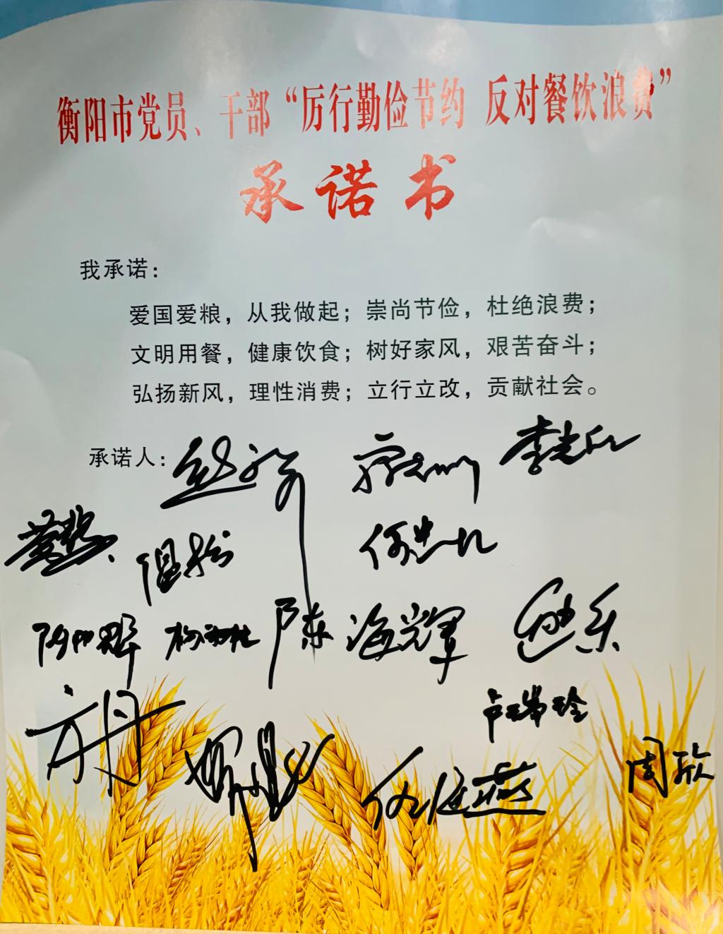 会后,全体党员签署了《衡阳市党员、干部厉行勤俭节约 反对餐饮浪费承诺书》。