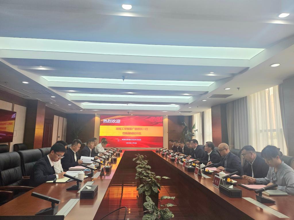活动结束后,曾广胜一行与望城经开区党工委书记、望城区委书记秦国良,望城区党工委副书记、管委会主任周剀等经开区相关人员就如何开展深度合作进行座谈。双方在科研成果转化、人才引进、产业转型升级等方面开展深入广泛合作,打造校地园企、产学研教融合发展的合作典范达成共识。学校党委委员、副校长黄红卫,党政办公室、科技与校企合作处、财务处、后勤基建处、国有资产管理处相关同志参加座谈。(文/周欣  一审/蒋志刚  二审/吴远志  三审/朱锋华)