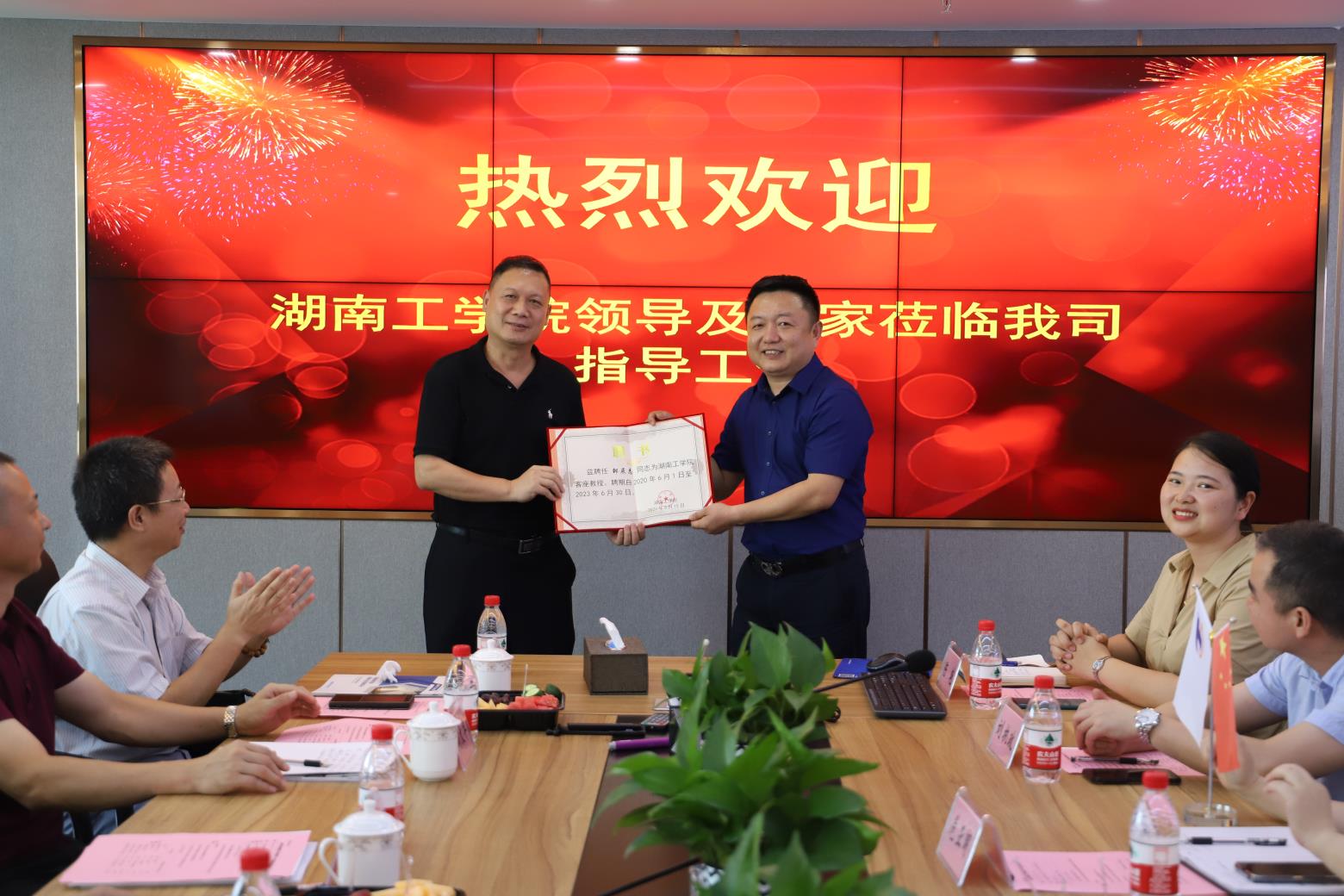 在热烈的掌声中,校长罗建华教授为展通公司董事长邹展志先生颁发客座教授聘书,他希望邹展志先生在获聘客座教授后,要继续为学校办学实力整体提升贡献力量。