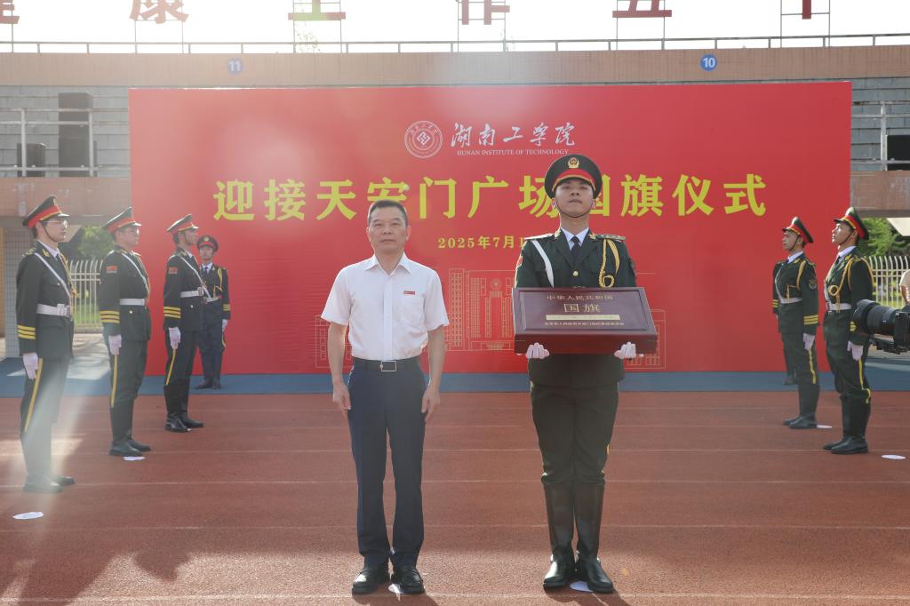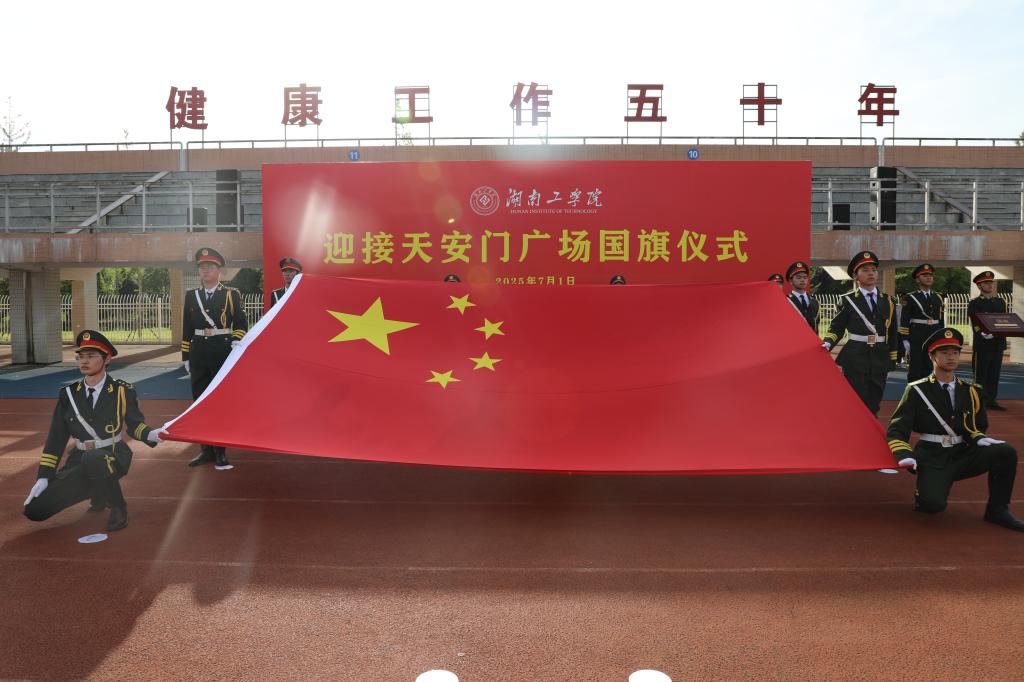 7月1日上午,在中国共产党成立104周年之际,学校在北运动场举行迎天安门国旗仪式。校党委书记曹执令庄重地将一面曾在天安门广场高高飘扬、承载着神圣使命的五星红旗,郑重交接给校国旗护卫队。来自全校的师生代表1200余人共同见证了这一庄严时刻。仪式由校党委副书记何建雄主持。
