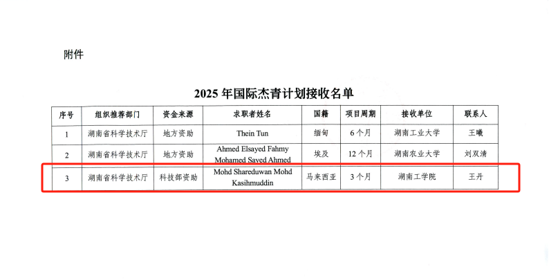 近日,科技部国际合作司正式公布2025年度第一批“国际杰青计划项目”接收名单,英国上市公司官网365马来西亚籍Mohd Shareduwan MohdKasihmuddin脱颖而出,成为本年度湖南省首批立项的三个项目之一。这是英国上市公司官网365继2024年获批3人实现该项目“零的突破”后,在该项目上实现了2025年度的开门红。(文/王丹 肖亚斌 审稿人/一审:彭婷 二审:彭国柱 三审:肖中云)