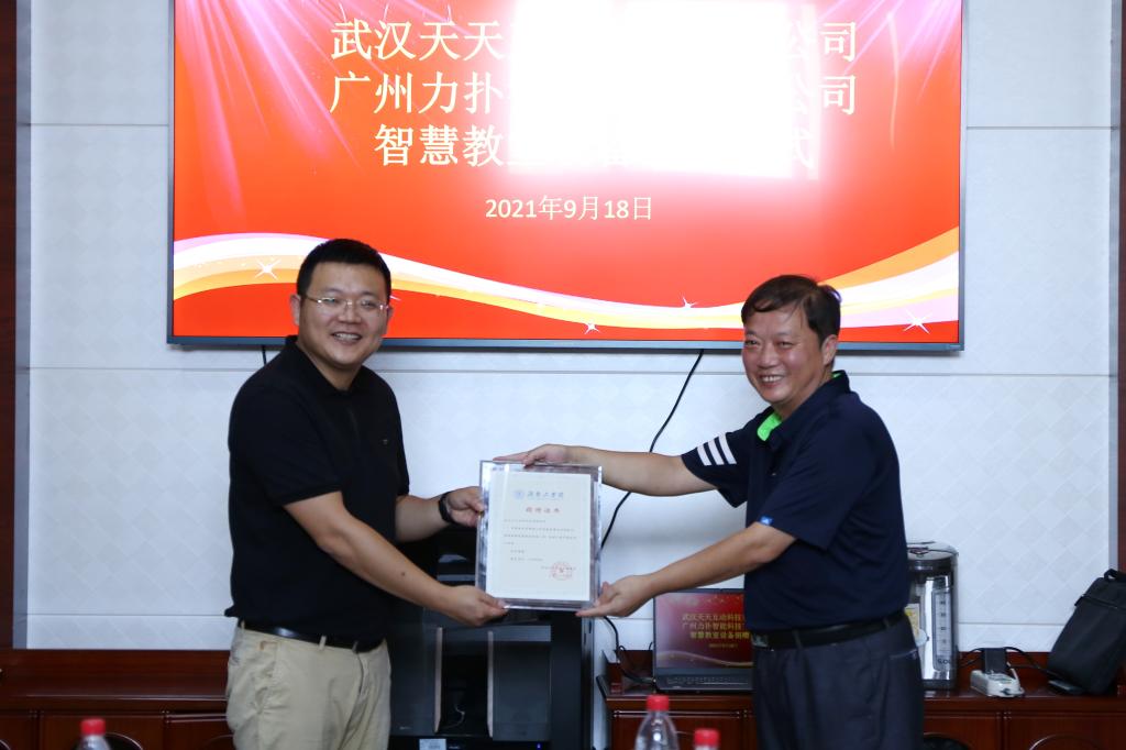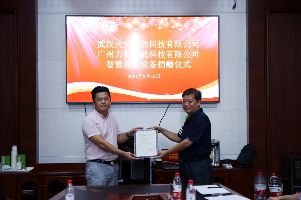 黄红卫致欢迎词,他表示:“此次两家爱心企业为英国上市公司官网365捐赠智慧教学设备,以服务教学为核心,以课堂为突破口,提供了教室智能管控、课堂互动、教学大数据服务一体化平台。通过采用人工智能、物联网、大数据和云计算等新技术围绕课前、课中、课后教学闭环,实现动态教学数据全采集,助力学校教学改革。”随后,黄红卫为武汉天天互动科技有限公司和广州力扑智能科技有限公司代表颁发了捐赠证书。