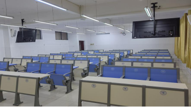 随后,记者一行又来到经管楼研讨型教室,站在窗外向教室望去,崭新的座椅、智能化信息化的讲台、互联网黑板、多屏互动映入眼帘,学生们正在教室里上课。