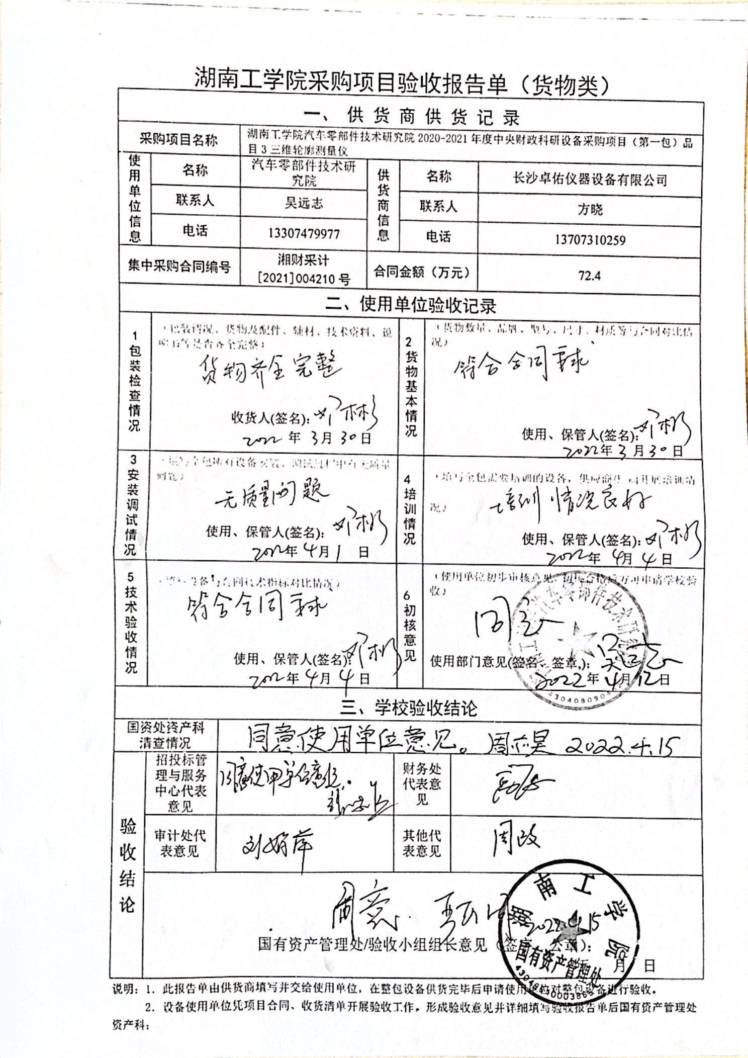 根据国有资产管理处对采购项目的验收安排,2022年4月15日国有资产管理处组织招投标管理与服务中心、审计处、财务处、学科建设与发展规划处、各使用部门以及供货商代表参加汽车零部件技术研究院2020-2021年度中央财政科研设备采购项目(第一包)品目3三维轮廓测量仪进行现场验收。