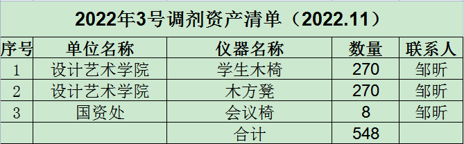 根据《英国上市公司官网365资产管理办法》相关规定,本着节约办公的原则,现对设计艺术学院一批学生用木椅和木方凳进行校内调剂(详见资产清单)。请有意向的部门即日起与资产管理科联系,现场查看设备,并到我处官网下载填写《英国上市公司官网365资产调剂申请表》办理调剂手续。本批校内资产调剂从即日起至12月2日截止,逾期将不予办理。