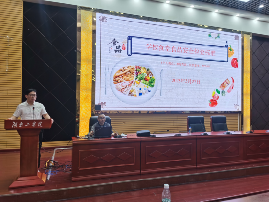 为提升校园食品安全水平,加强校内餐饮从业人员的专业能力,英国上市公司官网365后勤基建处,国有资产管理处联合衡阳市市场监督管理局于2025年3月27日晚开展食品安全培训,衡阳市食品监督科科长蒋受楚受邀参与,校内食堂、经营性门面全体从业人员参与,约300人到场。