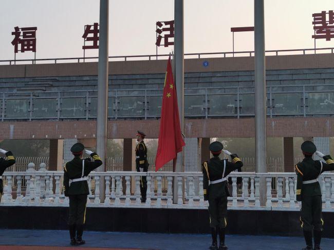 升旗仪式在雄壮的国歌声中拉开序幕,五星红旗冉冉升起,全体师生肃立注目,向国旗敬礼,表达对祖国的无限热爱和崇高敬意。