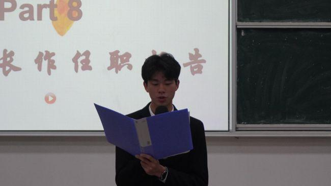 乘风破浪,砥砺前行。在观看三个高校与各二级院校青协同事们的祝福视频以及本院青协的部门介绍视频后,化环青协前会长米斌轩对去年工作进行总结并做离职报告,交接会旗,接着现任会长何宇做就职报告,并发起了“影寻湖工之美 书漂公益之爱”的校园公益活动。