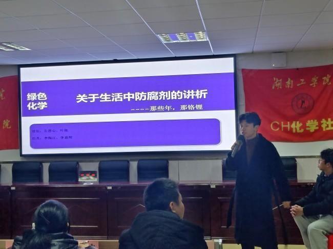 本次化学知识竞赛决赛由初露锋芒、争先恐后和奋力一搏三个环节组成。在第一个环节中,每位选手依次回答问题,把自己所储备的化学知识运用得淋漓尽致。第二个环节采用的是小组抢答模式,要求参赛者手速快,思维活跃。场上每一位选手都精神紧绷地注视着抢答器,主持人提出问题后迅速抢答,每组选手你追我赶将比赛推向了高潮。最后,到了最能体现出参赛者对基础化学知识掌握的奋力一搏环节,本环节需要选手们讲述关于生活中的一个化学案例的分析,讲述过程中选手们还带领观众一同学习生活小常识,加深了大家对化学的兴趣,在等待统分期间,黄莎、蒋佩珈同学为大家送上合唱《年轮》。