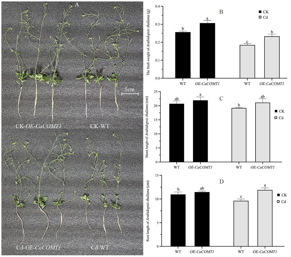 在对照条件下,野生型拟南芥中检测不到CaCOMT1的表达,只有AtCOMT1可以被检测到(4B)。对照下,在OE-CaCOMT1拟南芥中CaCOMT1的表达量比AtCOMT180(4B)。此外,在OE-CaCOMT1拟南芥中,AtCOMT1的表达量比野生型拟南芥显著降低32%(4B),说明CaCOMT1可以抑制拟南芥中AtCOMT1的表达。镉处理显著提高了野生型和OE-CaCOMT1拟南芥的AtCOMT1,但CaCOMT1的表达不受影响(4B)