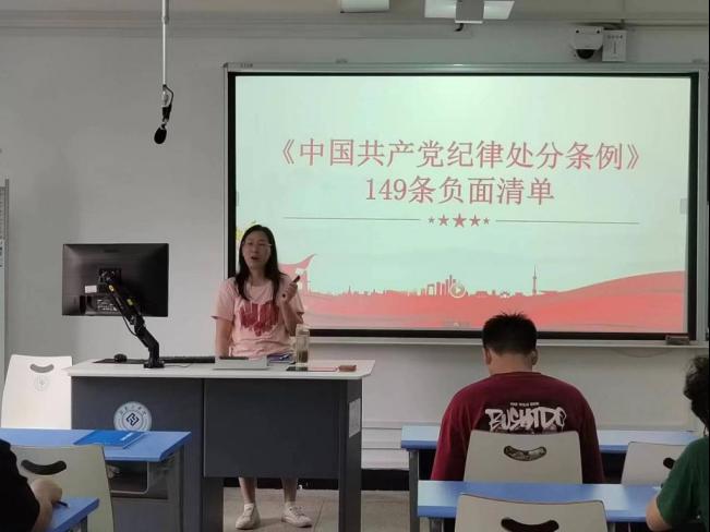 蔡玲为学生党员解读《中国共产党纪律处分条例》负面清单,帮助学生第一党支部的同志们更好学习《中国共产党纪律处分条例》。课上,她引用警示教育典型案例为学生党支部开展党纪教育,以事实告诫青年学生党员“青春不能任性”。她号召青年学生党员学《条例》、守底线,做有理想、敢担当、能吃苦、肯奋斗的新时代好青年。