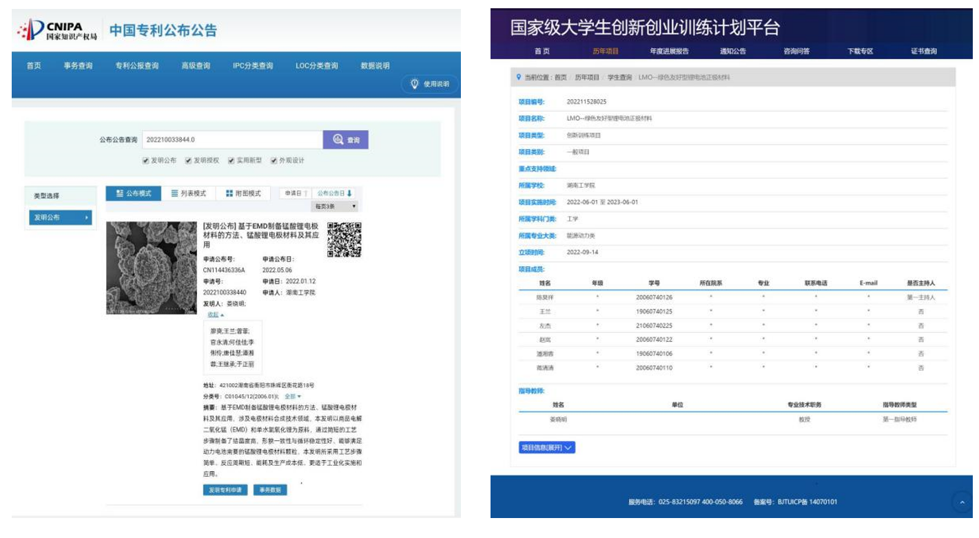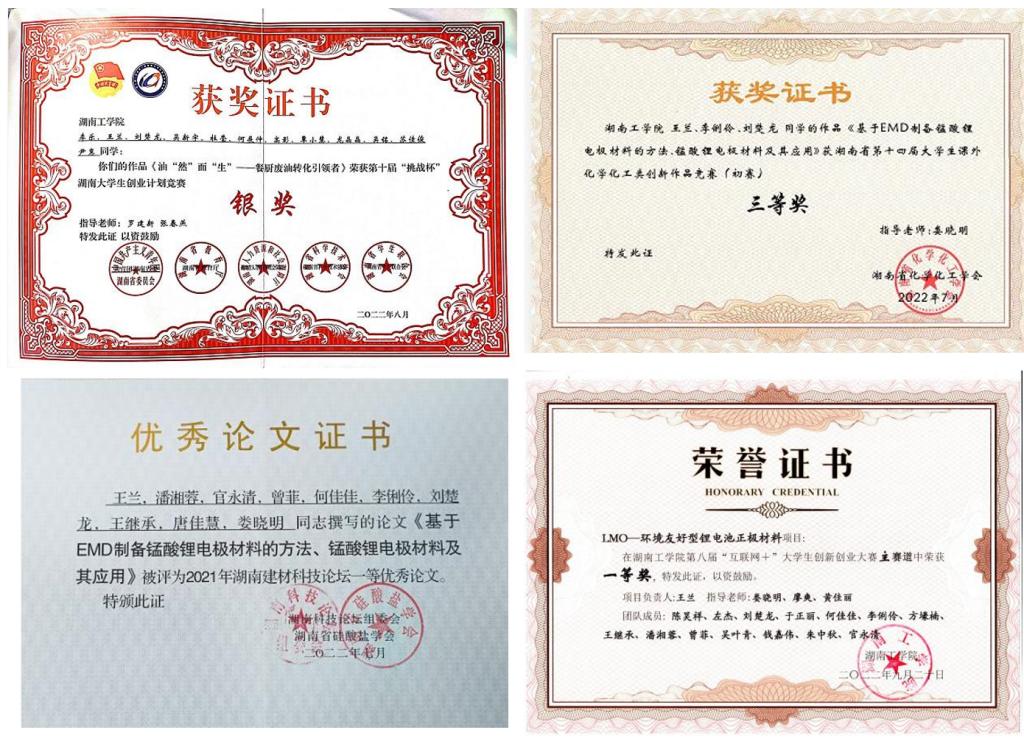 另外,王兰同学刻苦钻研,她尝试以商品电解二氧化锰(EMD)和单水氢氧化锂为原料,在老师的指导下,通过简单的步骤制备了结晶度高,形貌一致性与循环稳定性好、能够满足动力电池需要的锰酸锂电极材料颗粒,工艺步骤简单、反应周期短、能耗及生产成本低、更适于工业化实施和应用。相关成果于2022年5月成功申请国家发明专利《基于EMD制备锰酸锂电极材料的方法、锰酸锂电极材料及其应用》(CN114436336A),相关成果于2022年9月在国家级大学生创新训练项目立项(202211528025),并获得2021年湖南省硅酸盐学会建材科技论坛一等优秀论文。