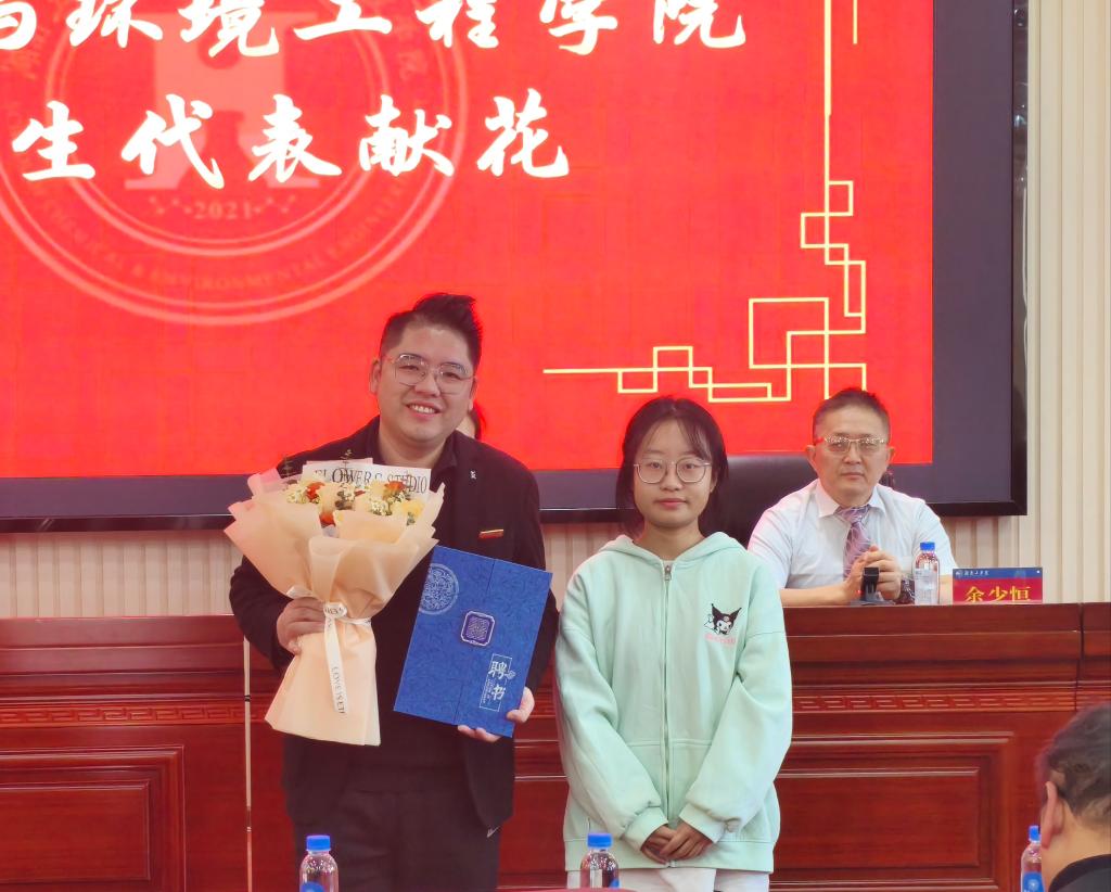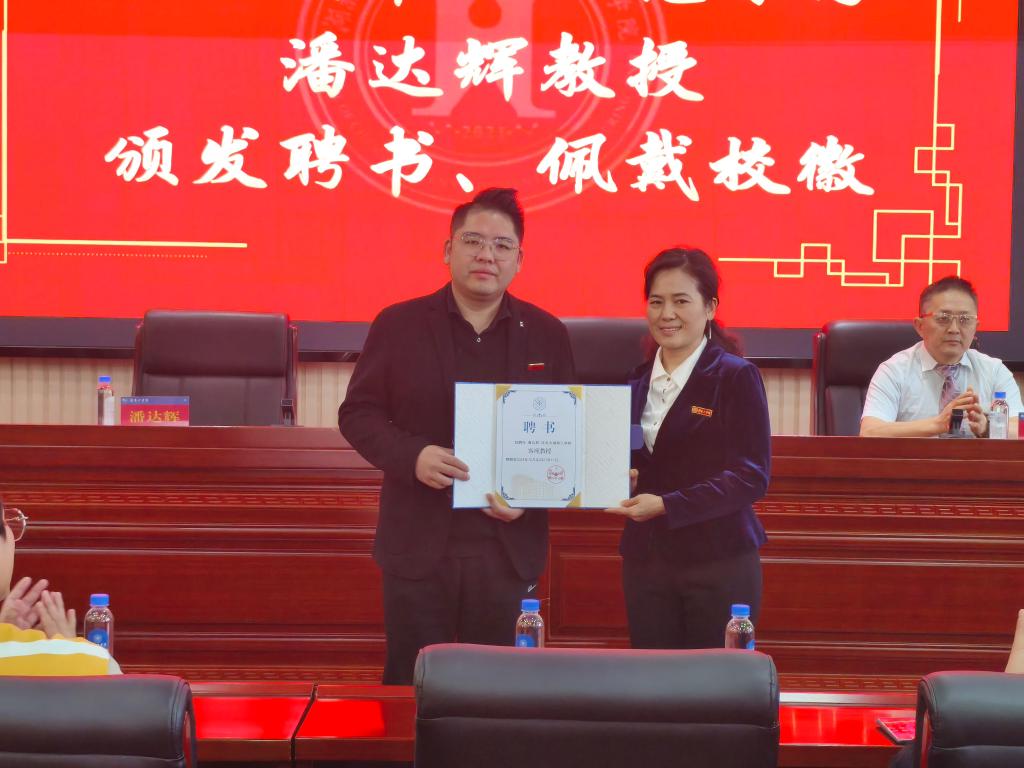 紧接着,王艳琼书记为潘达辉佩戴校徽并颁发客座教授聘书,学生代表为潘达辉教授献上鲜花。