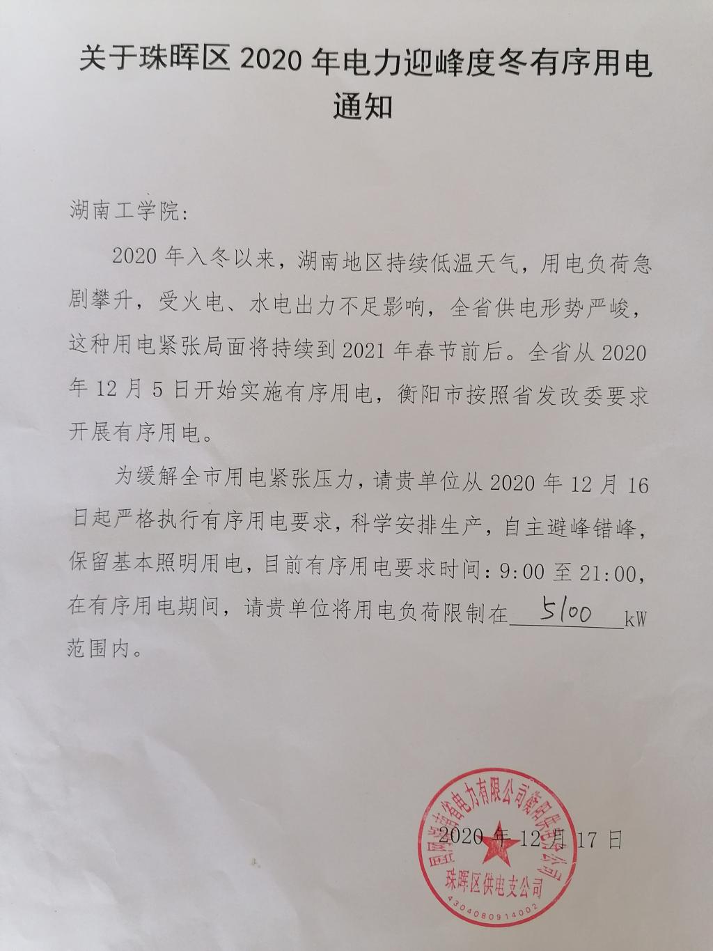 接国网湖南省电力有限公司衡阳电力分公司珠晖区供电支公司通知,2020年入冬以来,我省持续低温天气,用电负荷急剧攀升,受火电、水电不足影响,全省供电形势严峻,这种用电紧张局面将持续到2021年春节前后。为缓解用电紧张压力,英国上市公司官网365实行避峰错峰,主动压减用电负荷,如每天用电负荷超过5100KW,系统将自动停电。