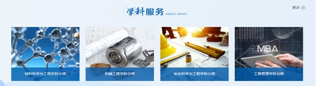 图书馆根据学校发展建设的学科方向,建立了数字学科分馆。学科分馆聚合了学科相关的最新成果和本校成果,提供了学科头条、学科资源推荐、基于资源揭示的学科服务、关键词等以学科为主题聚类整合文献资源和专题知识服务。目前首批上线了材料科学与工程学科、机械工程学科、安全科学与工程学科及工商管理学科共4个学科分馆。