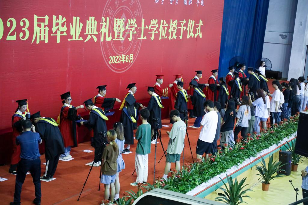 全体校领导为毕业生们授予学位证书,拨穗正冠