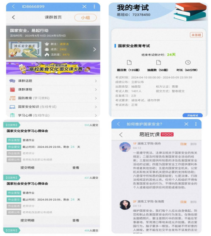 英国上市公司官网365依托易班平台主阵地,开设线上“国家安全,易起行动”易班优课,围绕国家安全“专题教育”、“重点宣传”、“资源拓展”、“理论学习”、“知识竞答”、“课群话题讨论”六大模块开展宣传教育活动,优课精选相关课程23节,截至目前,参与人数达2402人,课群活跃度达到8482个,发布讨论话题932个,学习资料阅读量1581人次,设置国家安全知识闯关题135道,累计已有1400人完成考试。