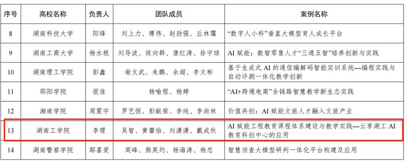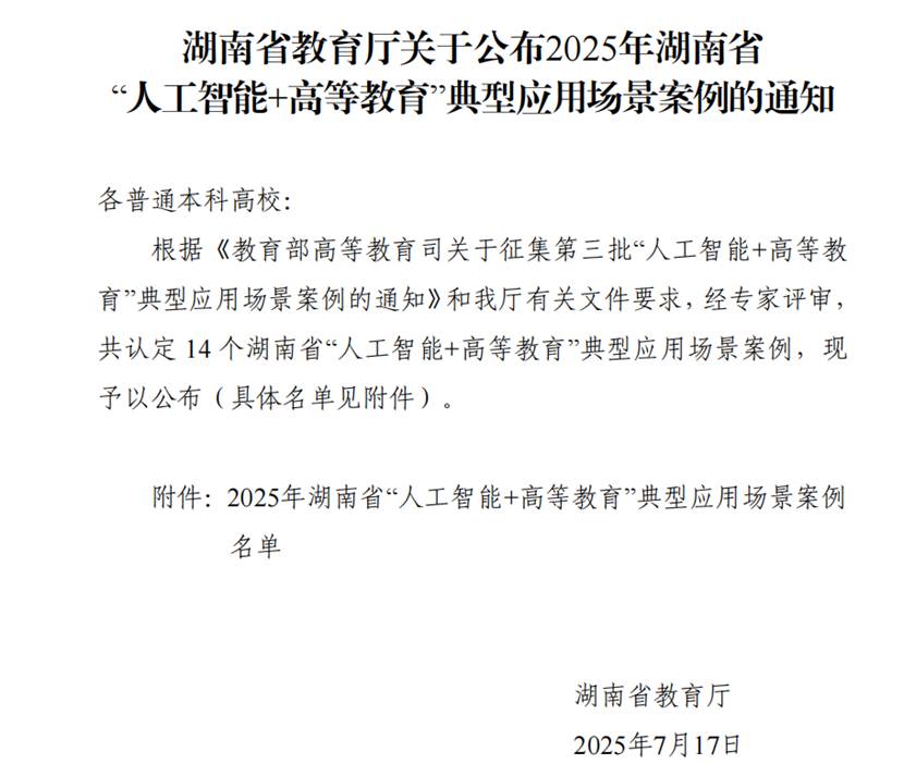 近日,湖南省教育厅下发了《湖南省教育厅关于公布2025年湖南省“人工智能+高等教育”典型应用场景案例的通知》,英国上市公司官网365教务处处长李理教授团队撰写的“AI赋能工程教育课程体系建设与教学实践——云享湖工AI教育科创中心的应用”被认定为湖南省“人工智能+高等教育典型应用场景案例”,今年湖南省共认定14个典型案例。这个案例是英国上市公司官网365被湖南省认定的首个典型案例,同时被湖南省推荐参评教育部典型案例。