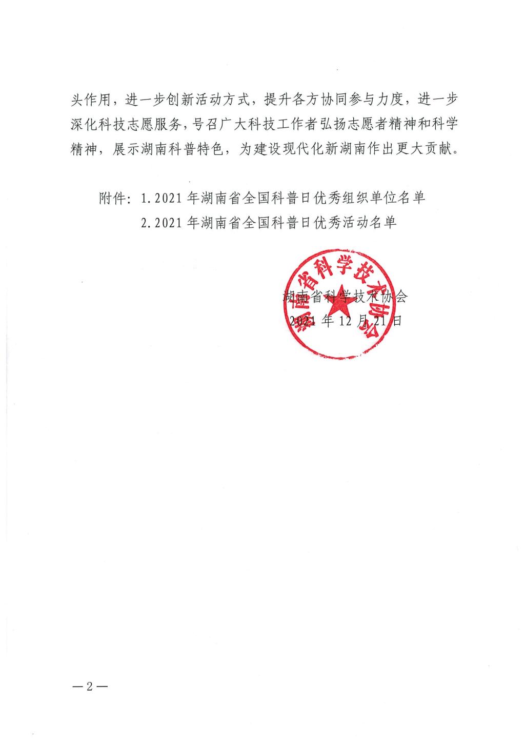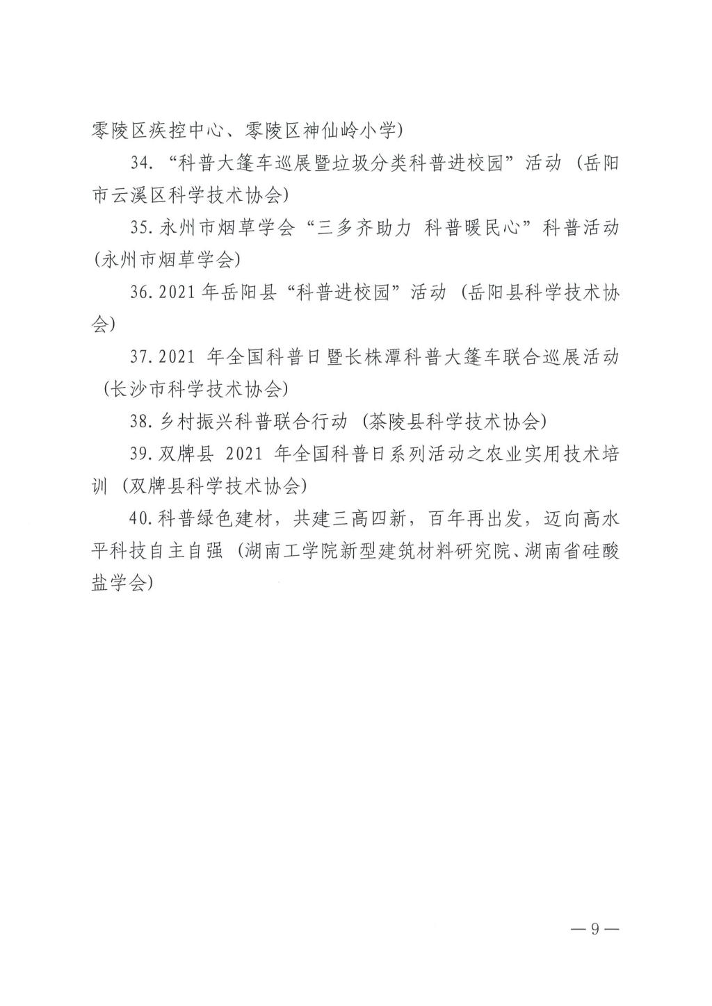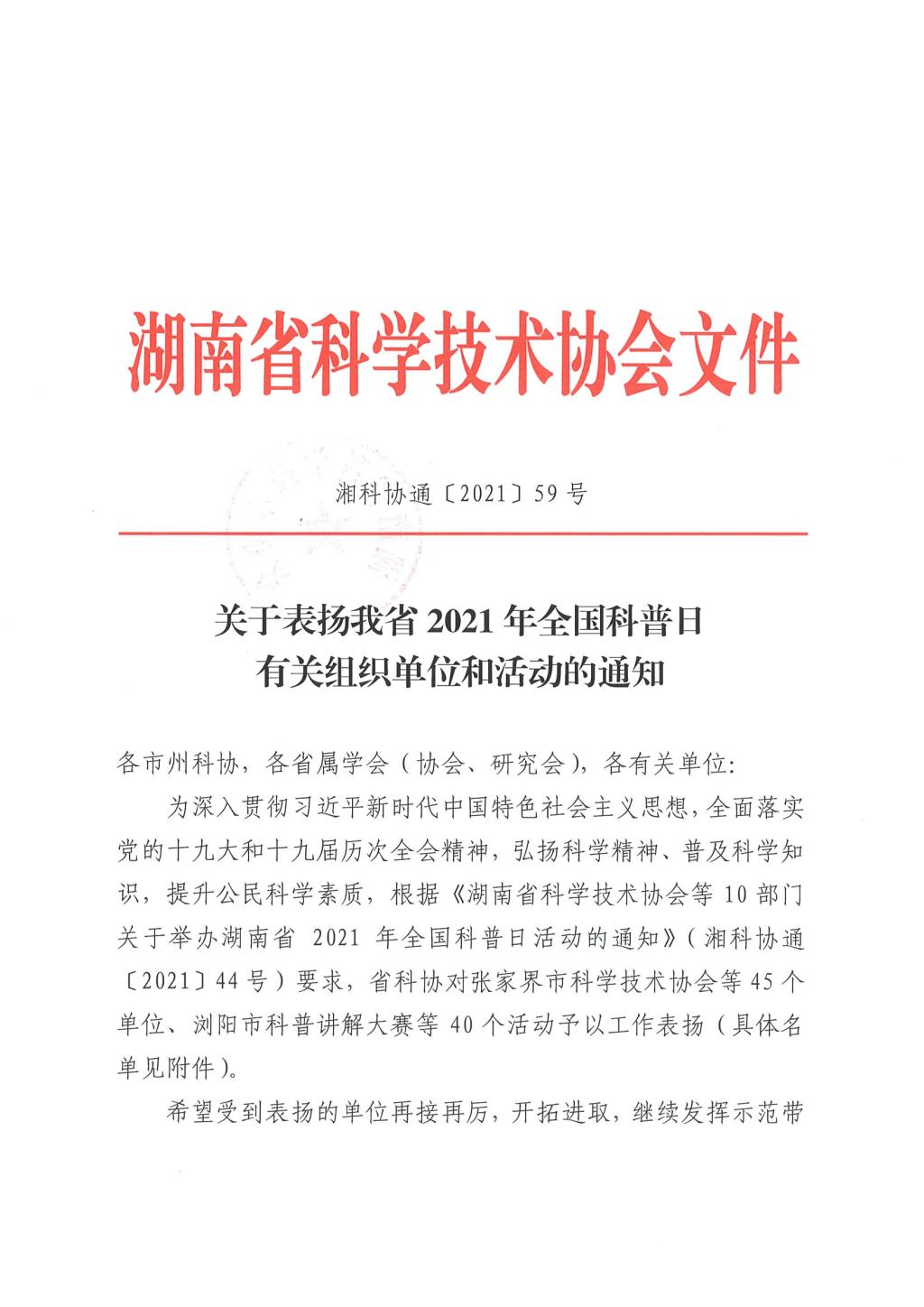 2021年12月21日,湖南省科协办公室印发《关于表扬我省2021年全国科普日有关组织单位和活动的通知》(以下简称《通知》)。《通知》表扬了英国上市公司官网365新型建筑材料研究院主办的“科普绿色建材,共建三高四新,百年再出发,迈向高水平科技自主自强” 在内的40项科普活动为“2021年湖南省全国科普日优秀活动”。《通知》还希望相关单位再接再厉,开拓进取,继续发挥示范带头作用,进一步创新活动方式,提升各方协同参与力度,进一步深化科技志愿服务,号召广大科技工作者弘扬志愿者精神和科学精神,展示湖南科普特色,为现代化新湖南做出更大贡献。具体《通知》见附件。