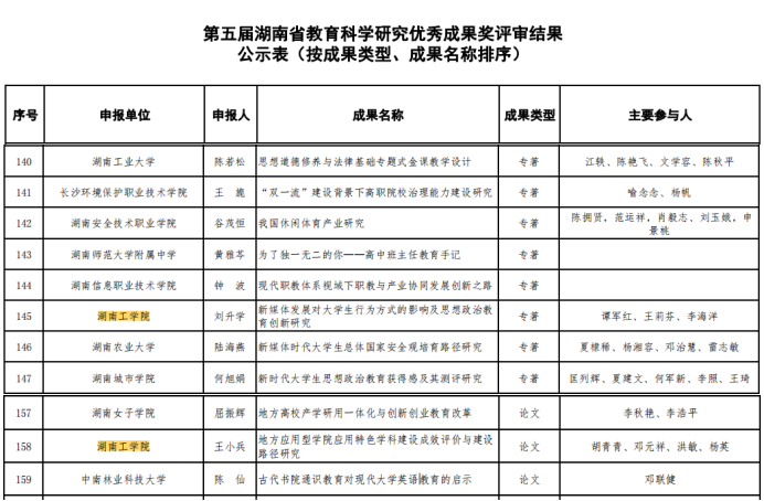 近日,湖南省教育科学规划领导小组办公室公布了湖南省第五届教育科学研究优秀成果奖评审结果,我院刘升学教授团队完成的专著《新媒体发展对大学生行为方式的影响及思想政治教育创新研究》、王小兵教授团队完成的论文《地方应用型学院应用特色学科建设成效评价与建设路径研究》获优秀成果三等奖。