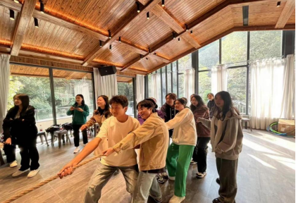 “拔河比赛”项目要求同学们要与队友默契配合,合力拉绳,从而顺利完成挑战。