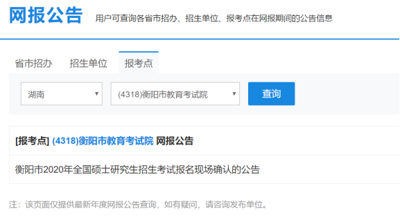 点击网报公告,选择报考点(注:报考点可选择在衡阳报考,也可选择在户籍所在地报考),这里有报考现场确认的时间和需要准备的材料。