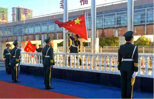 迎着朝阳,国旗护卫队步伐铿锵,将国旗护送到升旗平台。在激昂的国歌声中,五星红旗冉冉升起,在场师生集体向国旗行注目礼,满怀着对祖国无限的热爱。