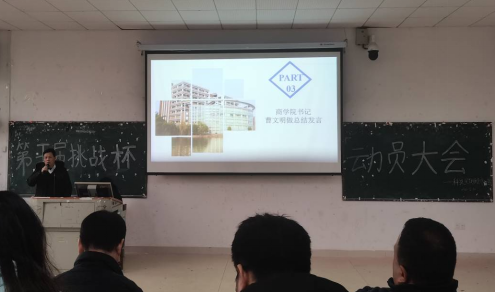 党委副书记赵晓军给从赛事要求、重要性与意义等方面认真解读,号召并指导院团委学生会、各班班团进行赛事宣传与组织,鼓励同学们积极参与,为商学院创新创业添砖加瓦。