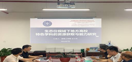 国家社科基金教育学项目《生态位视域下地方高校特色学科的资源获取能力研究》课题主持人王小兵教授从研究内容与方法、成果出版与应用、成果获奖与反响、主要观点与建议等方面介绍了研究成果。他指出,在学校职能部门的支持和领导下,在课题组全体成员的配合和努力下,课题组在中国高等教育、中国高校科技、中国教育报(理论版)等等权威刊物发表论文8篇;阶段性成果共计被引、下载近2000次;获得全国一级学会、湖南省社科联合会颁发一等奖2个,二等奖2个,获得省级教学成果奖1项、省级人才称号1个。课题所取得的一些阶段性成果已符合结题的基本要求。