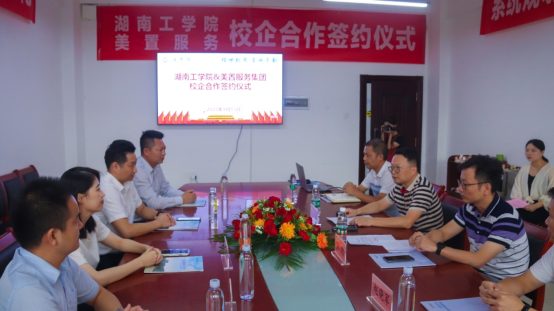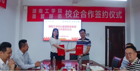 美置服务集团总部人力资源总监陈桂婵、长沙公司总经理助理雷旭、长沙公司人力资源经理成志勇、长沙公司项目群经理李明祥、学校教务处处长李理、商学院院长王小兵、商学院党委副书记赵晓军、商学院副院长黄飞出席签约仪式。