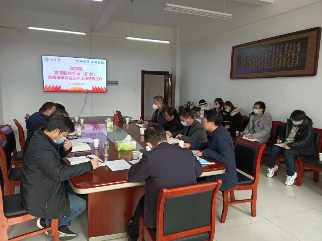 商学院院长王小兵传达了学校审核评估整改工作布置会精神并部署审核评估工作,对照审核评估整改工作进行任务分工,要求全体教师要提高思想认识和政治站位,主动谋划、敢于担当,高标准、严要求、抓重点,高质量完成审核评估整改工作。商学院党委书记曹文明要求全体教师提高对立德树人的认识,重点督促、团结肯干,以最高的执行力完成审核评估整改工作。各分管院领导作表态发言。