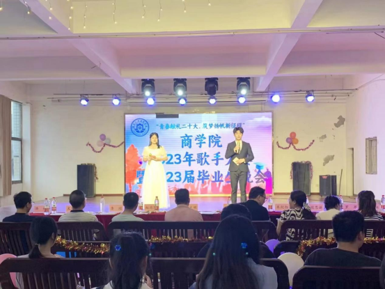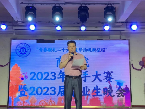 5月26日晚,商学院在创业园三楼举办“青春献礼二十大,筑梦扬帆新征程”2023年歌手大赛暨2023届毕业生晚会。商学院党委书记曹文明、院长王小兵、副院长朱纪红、副院长李闯、党委副书记赵晓军、学工办主任段思遥、教师代表、全体辅导员参与本次活动。