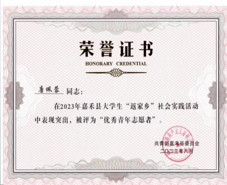 唐佩蓉同学在实践期间严格要求自己,工作勤恳、认真负责,运用所思所学助力乡村振兴,生活积极向上、与同事之间相处融洽,听从领导安排,推动乡村工作的顺利开展,得到当地团委书记的高度肯定,被评为“优秀青年志愿者”。
