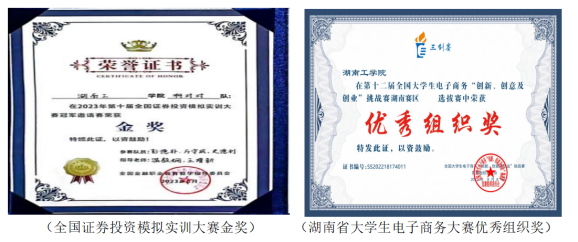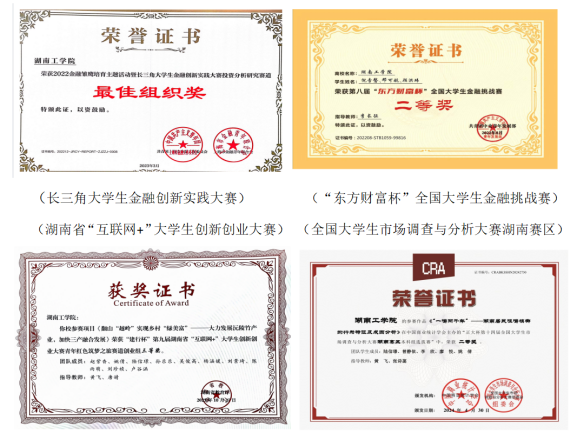本专业学生获大学生创新创业竞赛国家银奖1项,省级一等奖1项,省级二等奖2项、三等奖6项,承担创新创业训练计划项目10余项,获湖南省大学生企业模拟经营竞赛一、二、三等奖共7项,全国大学生“新道杯”沙盘模拟经营大赛二等奖1项,湖南省大学生电子商务大赛一、二、三等奖20余项,全国金融与证券投资模拟实训大赛一、二、三等奖30余项,“挑战杯”创业计划大赛省级银奖、铜奖各1项。