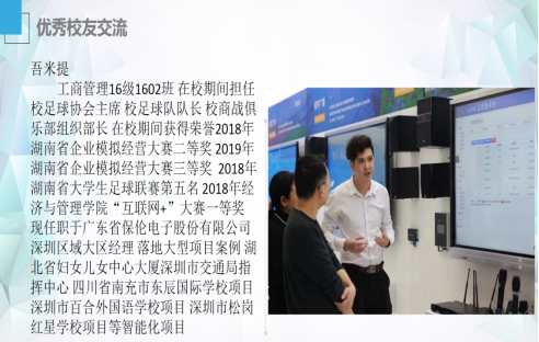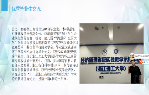 邀请了优秀校友通过线上分享他们的经验,雷鸣介绍了自己选调生的考试及面试经验,李嘉豪分享了考研的经验,并告诫学弟学妹要养成良好的个人习惯,提高自己的抗压能力;梁嘉美提醒大家不要产生过度焦虑,应当调整好自己的心态;邓高雄作为创业成功的范例,告诉了大家要敢于尝试,多参与学校的各类活动。