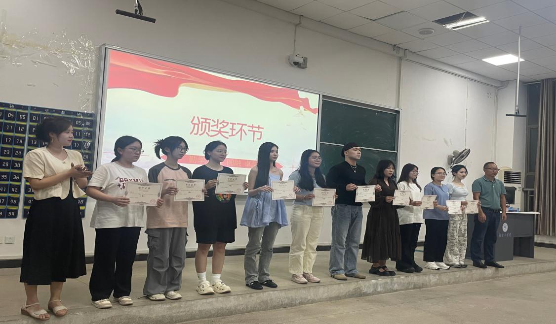 在颁奖仪式中,主持人宣布获奖成员,与会领导、教师为优秀同学颁奖并合影留恋。