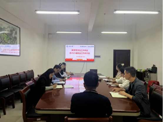 10月14日,商学院于经管楼315会议室召开2025届毕业生就业工作研讨会。学院党委书记王小兵、副书记赵晓军、组织员谭少华、仇海燕及全体辅导员参加会议。