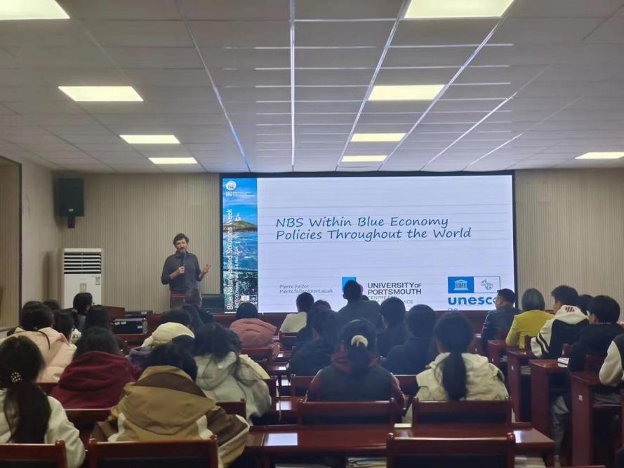 Pierre Failler教授以“NBS Within Blue Economy Policies Throughout the World/全球蓝色经济政策中基于自然的解决方案”为题展开学术讲座。会议伊始,朱纪红对Pierre Failler教授的到来表示热烈的欢迎,并就其个人情况进行介绍。Pierre Failler教授是普茨茅次大学商业与法律学院经济学教授、教科文组织海洋治理教席持有人和蓝色治理中心主任。他研究的领域是“蓝色经济”,即可持续利用海洋和海岸线促进经济增长,同时保护生态系统的健康。