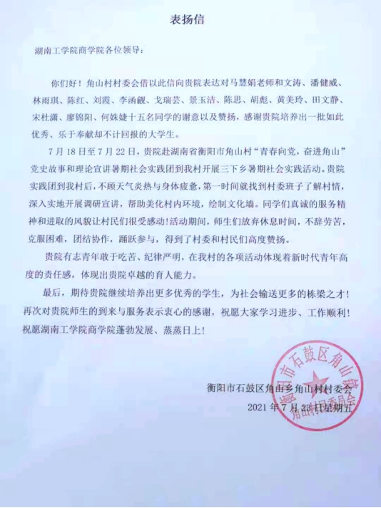 五、青春向党,感恩相伴。志愿服务结束之际,角山村村委会对实践团队成员给予了高度的评价,为表达对实践团成员付出的肯定,特向学院寄来感谢信。志愿者们纷纷表示,在此次实践活动中受益匪浅,在接下来的学习生活中,始终坚定永远跟党走的信念,不忘初心,砥砺前行,用实际行动助力乡村振兴,不断增强作为新时代青年的志气、骨气、底气,让青春闪耀在祖国最需要的地方。