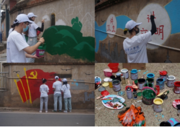 四、知行合一,助力建设美丽乡村。7月20日上午宣讲团成员与角山村任贤能书记对接商议、设计并敲定文化墙的构图构思。到达指定地点后先后完成杂草修整和墙面清理等工作,清理干净后在墙面勾勒出草图,从准备颜料画笔到上色完善,在实践团成员们三天的共同努力下,原本斑驳单调的墙面也变得绚丽丰富起来,任书记对此次活动表示十分支持,并时刻关注着活动进程、进行指导与帮助,角山村村民对于实践团绘制文化墙的行为也表示肯定和赞许。通过绘制文化墙,不仅美化了乡村,也将艺术融入到农村生活。以这种独特的方式传播文化,助力新农村建设。
