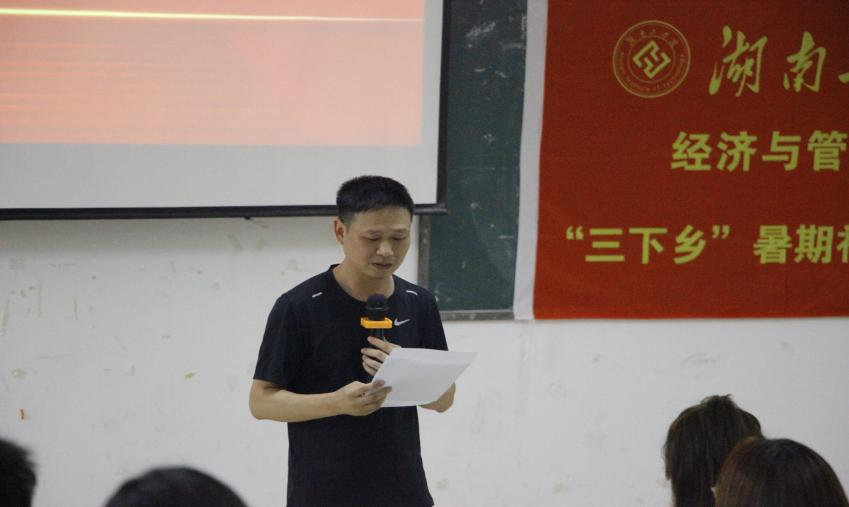 张忠贤发表动员讲话,他表示,经管学院高度重视“三下乡”社会实践活动的组织和开展,暑期“三下乡”社会实践活动是新时代青年大学生运用知识、施展才华、磨炼意志、实践成才的大课堂。对参加本次社会实践活动的志愿者提出三点要求:一是要珍惜锻炼机会,坚定理想信念,厚植爱国情怀;二是注重社会实践活动的宣传和活动成果的转化在实践中练就过硬本领;三是夯实专业知识、做到学以致用,在服务基层中展现经管学子风采;四是严守安全底线,饱含热情地投入到服务社会和服务人民的社会实践活动之中,用实际行动奉献青春力量