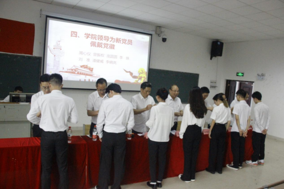 新党员集中宣誓仪式在庄严的《国际歌》声拉开帷幕。张忠贤宣读了经管学院2021年5月新发展党员名单并带领全体新党员面向党旗郑重宣誓。学院全体党委委员分别为新党员代表佩戴党徽。