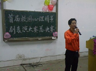 2011 523日下午七时许,由经管系承办的学院首届校园心理情景剧表演大赛总决赛在南校区T1教室拉开序幕。本次大赛的评委及嘉宾经管系党总支书记袁勤、副书记黄春喜、院心理咨询章红英老师。计信系周艳红老师、材化系申杰文老师、机械系冯志敏老师、经管系舒畅、聂添、张勇、刘刚老师以及各系团总支学生分会学生代表近300人参加了此次大赛。