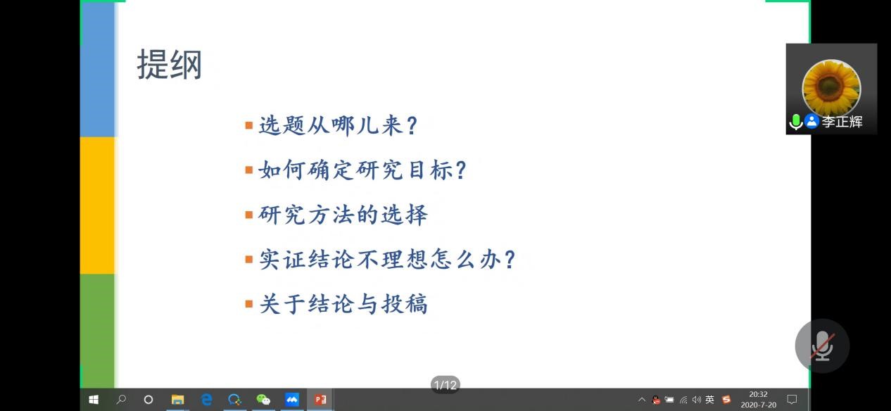 720日晚,广州大学金融研究院教授、博士生导师李正辉教授以腾讯会议形式为经济与管理学院学术骨干开展了关于“学术论文写作过程中常见问题”的专题讲座,副校长刘俊学、经济与管理学院院长赵少平、副院长朱纪红、工商管理应用特色学科团队成员及学院部分老师参与了此次讲座,讲座由副院长朱纪红主持。