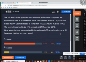 此次公开课,王沛文老师主要讲解了contract revenue and costs—4 steps 的内容,并为同学们分析了该内容的重难点,强调其重要性,希望同学们通过学习能熟练运用该知识点。课堂上师生通过课堂派进行直播授课,课中设计了抢答、提问、弹幕等教学形式,王沛文老师还利用Excel对所学内容的练习进行了讲解,在保证课堂效率的同时,更加深了学生对知识点的理解。本次线上公开课课堂气氛活跃,抢答环节中,同学们积极参加,弹幕反馈学习效果,课后还采用QQ群进行答疑等。