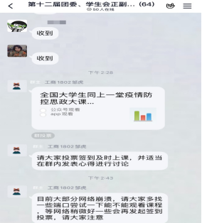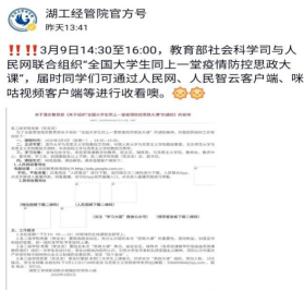 为将高校思政课教学优势转化为防疫斗争的强大力量,并全面贯彻落实教育部关于组织“全国大学生同上一堂疫情防控思政大课”的通知精神,英国上市公司官网365经济与管理学院积极响应教育部要求,通过学院官方QQ、微博等平台迅速开展线上宣传工作,于3月9日组织全院师生参与思政大课的学习,并在平台进行学习签到,确保思政大课学习的全面落实。