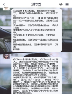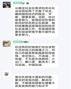 这堂“线上思政思政大课”在经管学子中热议。酒店管理学生文涛在课后发表学习感受:青年大学生应该加强对党中央关于疫情各项政策的学习。不信谣,不传谣,把疫情的各方面信息学习好,并尽力向身边的广大人民做好宣传普及工作;金融工程学生贺龙坚信:在以人民为中心的党的领导的带领下,具有伟大团结精神的人民,一定能度过这次灾难。而作为新一代青年,我们应该做到,胸有大志,心有大我,肩有大任,行有大德;会计学学生李薇深刻意识到:在疫情防控期间,大学生要学会理性认识,避免恐慌,坚决打赢心理战;要增强防控意识,合理安排假期,做好学习规划;工商管理学生邓颖在讨论中表示:身为青年大学生,要把这次的疫情当作是一种学习的机会,去学习前辈这种处变不惊,舍己为人的精神,要利用好这个机会,做好人生规划,树立正确的人生观,价值观;国际经济与贸易学子易凯在观看后感慨道:打赢疫情防控阻击战,我们要有“立根”的顽劲儿。越是艰难越向前,越是艰难越挺立。要有“任尔”的豪劲儿,凌寒暑而不渝其色。